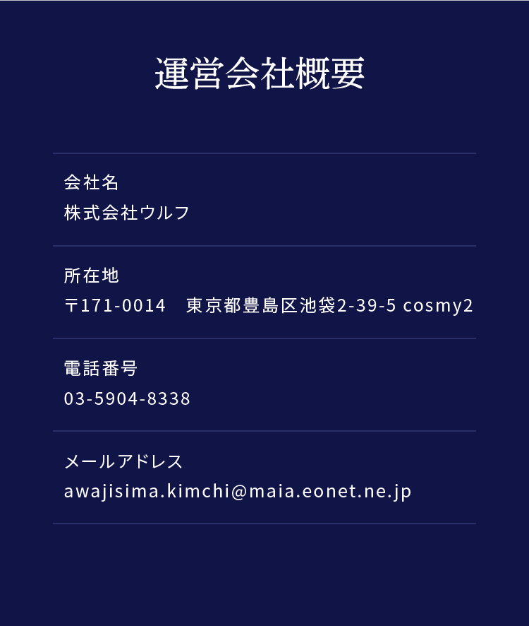 株式会社ウルフ(以下,「当社」といいます。)は,本ウェブサイト上で提供するサービス(以下,「本サービス」といいます。)におけるプライバシー情報の取扱いについて,以下のとおりプライバシーポリシー(以下,「本ポリシー」といいます。)を定めます。 販売業者:株式会社ウルフ 担当責任者:東田 所在地:171-0014, 東京都豊島区池袋2-39-5 cosmy2, 日本 電話番号:03-5904-8338 メールアドレス:awajisima.kimchi@maia.eonet.ne.jp 販売価格:各商品ごとに表記 商品代金以外の必要料金:配送料 支払方法および支払の時期:各決済方法に準ずる 商品の引渡時期:3営業日以内に発送 商品の引渡方法:佐川急便 返品・不良品・キャンセルについて: ■お客様都合による返金 当店ではお客様都合による返金は受け付けておりません。 ■お客様都合による交換 当店ではお客様都合による交換は受け付けておりません。 ■商品等の不具合による返金 以下の条件にあてはまる場合、返金いたします。 対応条件 商品未開封、対応期間内に電話もしくはメールにてご連絡いただいたもののみ原則対応いたします。 対応可能期間 商品到着後2日以内にご連絡をいただいた場合 返金額 商品代金全額 返品送料 店舗負担 備考 返金を希望する旨、電話もしくはメールにてお申し付けください。 ■商品等の不具合による交換 以下の条件にあてはまる場合、商品等を交換いたします。 対応条件 商品未開封、対応期間内に電話もしくはメールにてご連絡いただいたもののみ原則対応いたします。 対応可能期間 商品到着後2日以内にご連絡をいただいた場合 返品送料 店舗負担 再送料 店舗負担 備考 同一商品の手配が不可能など交換に応じることができない場合がございます。その際は返金にてご了承ください。 ■キャンセル・返金・交換連絡先 電話番号 03-5904-8338 担当:岡村、東田 返品期限:商品到着後2日以内にご連絡をいただいた場合
